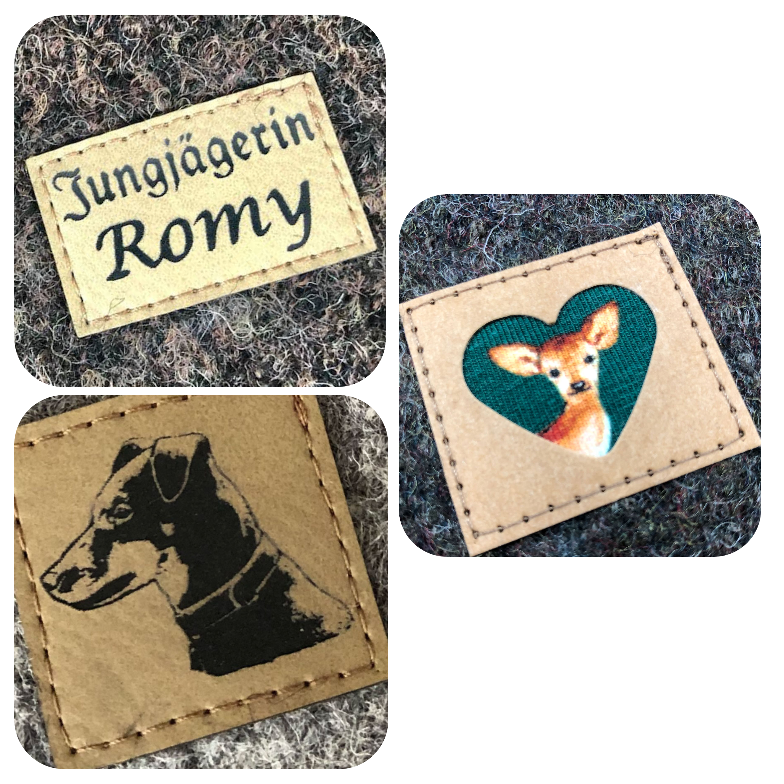 Aufnäher: Kunstleder (Jungjäger/in, Hund) bzw. waschbares Papier (Herz mit Reh)
