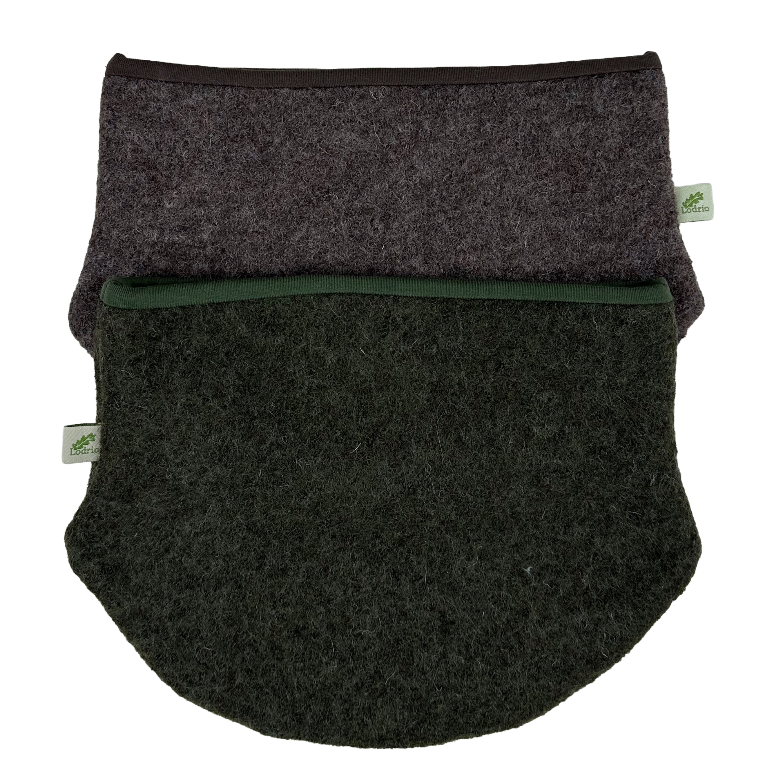 Du bekommst die Halssocke wahlweise in „oliv meliert“ oder „dunkelbraun meliert“.